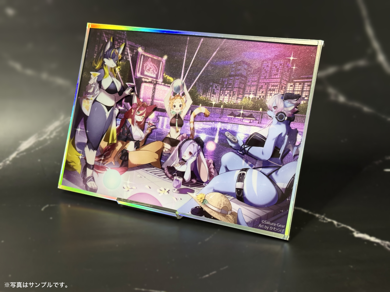 Bunnimalsに「ナイトプール」をテーマとした新グッズが登場! 二層印刷で立体感のあるイラストが楽しめる、A5サイズのアクリル色紙です。 背景はグリッター加工&フチはホログラム仕様で煌めくナイトプールの夜景を彩ります!